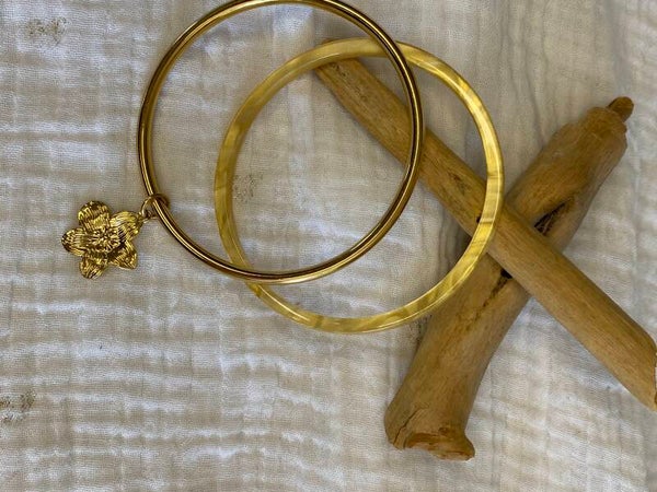 Bracelet double joncs en résine dorée avec pendentif fleur en acier inoxydable